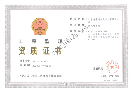 為拓寬監(jiān)理公司市場(chǎng),2016年公司申報(bào)了建設(shè)部公路工程監(jiān)理乙級(jí)資質(zhì),經(jīng)多方積極配合,省住房和城鄉(xiāng)建設(shè)廳的審查認(rèn)為我公司在人員資質(zhì)、技術(shù)能力、試驗(yàn)檢測(cè)設(shè)備、管理體系等方面均符合評(píng)審準(zhǔn)則規(guī)定,給予審批通過,并頒發(fā)了公路工程監(jiān)理乙級(jí)資質(zhì)證書,同意開展相應(yīng)類別建設(shè)工程的項(xiàng)目管理、技術(shù)咨詢等業(yè)務(wù)?!?br />